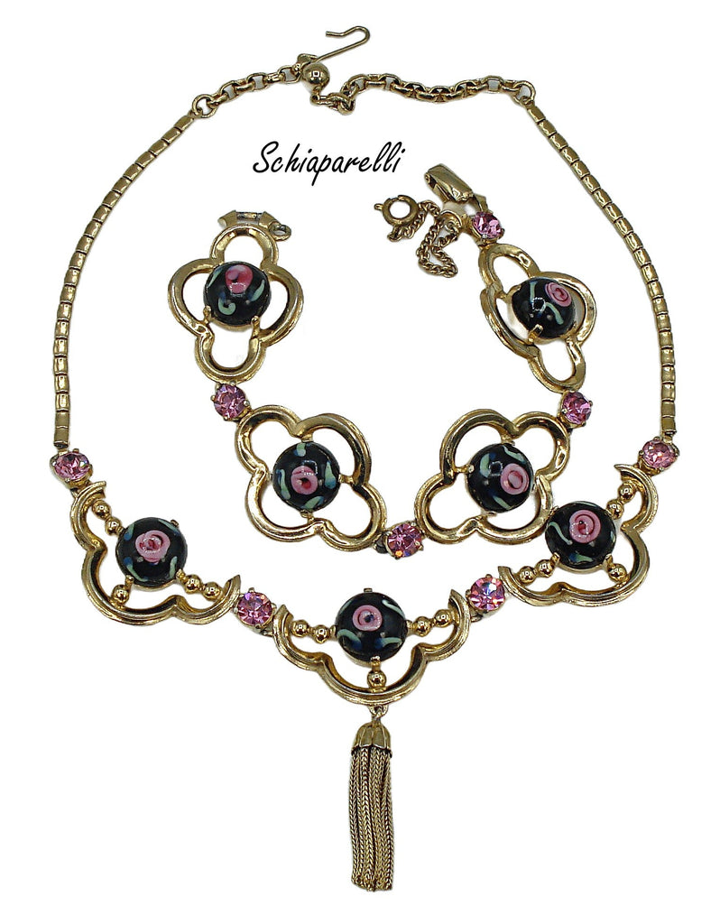 ~Schiaparelli Set - 16" x 2" Necklace - 7.5" x 1 1/8" Bracelet - Pink Black Green Painted Flower Glass Cabochons. Center Tassel Pink Rose Rhinestones. Gold Tone Prong setting open work scallop design.  Fold Over Clasp with Safety Chain.  Hook Clasp for Necklace.  Really Nice Vintage Condition.