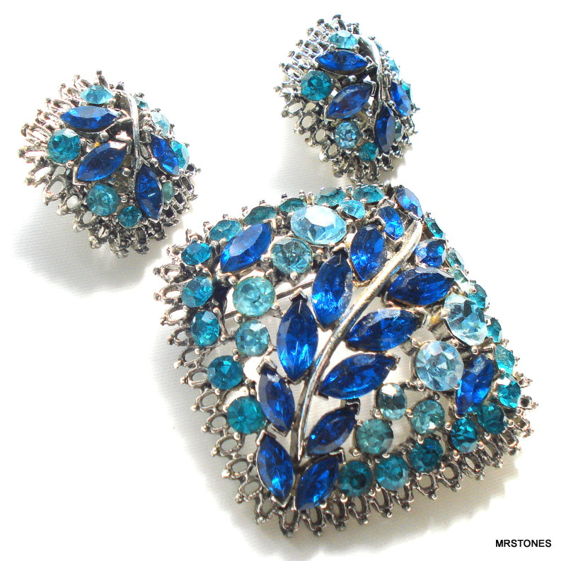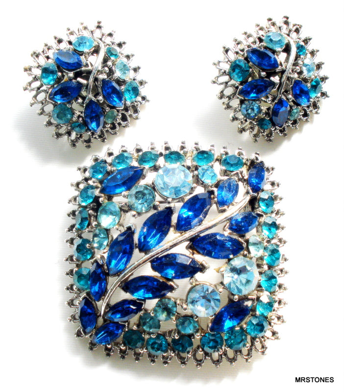 ~Set Brooch Earrings Variety Blue Rhinestones  Silver Tone Domed Antique Square Shape.  Capri Blue Marquises Blue Zircon Aqua.  1" Clip Earrings, 2" Brooch.