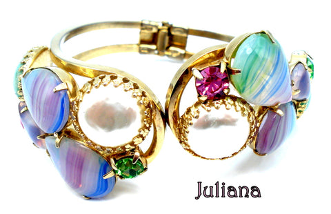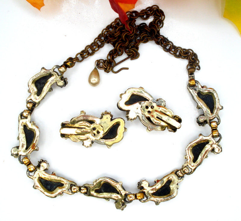 ~SET-Necklace Earrings Iridescent Kidney Shape Stones Faux Pearl Accents. Gold Tone.  18" x 5/8" for Necklace and 1 1/8" for Clip On Earrings.  Good Condition.