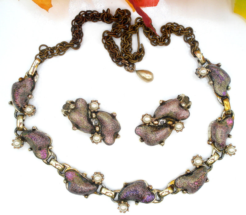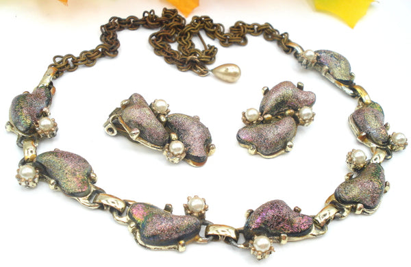 SET-Necklace Earrings Iridescent Kidney Shape Stones Faux Pearls