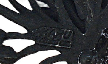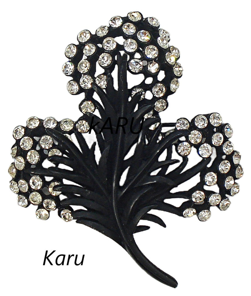 Signed Karu 2.5" Floral Brooch Black Japanned Enameled Crystal Round Rhinestones
