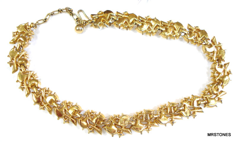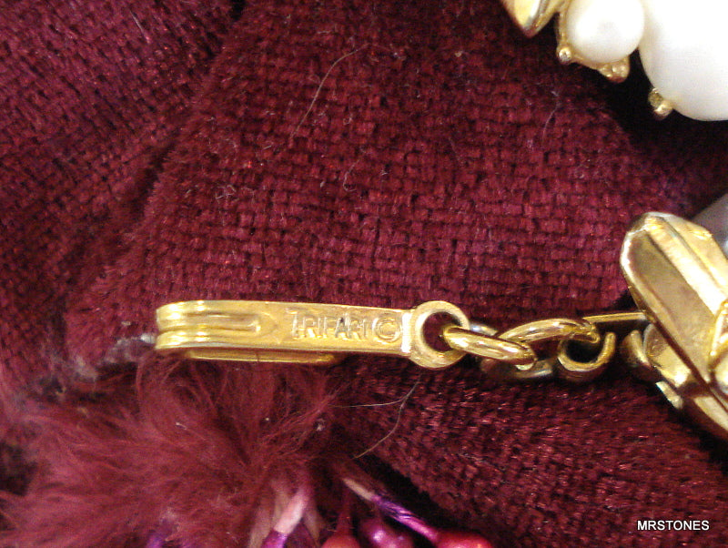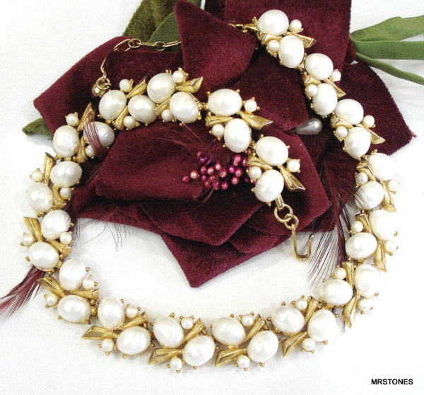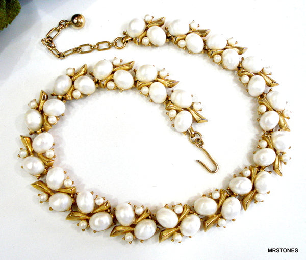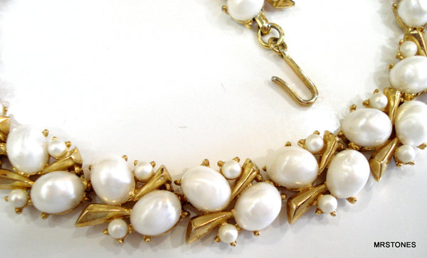 ~VINTAGE SIGNED TRIFARI CHOKER NECKLACE WHITE LUSTER FAUX PEARLS GOLD TONE RHODIUM PLATE.  16" X 5/8"