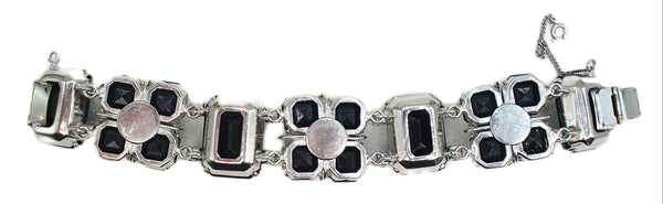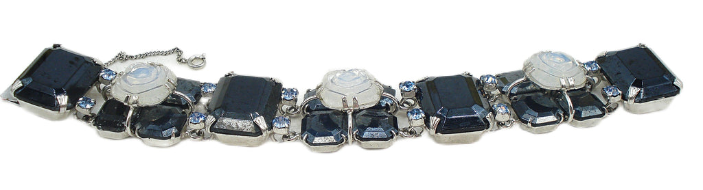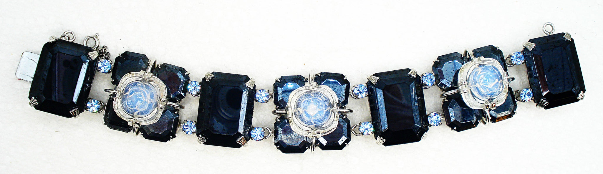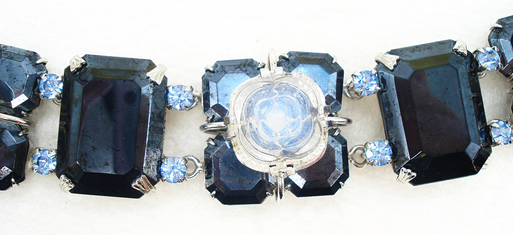 ~UNIQUE CHUNKY BRACELET Jet-Hematite Large Opal Rose Light Blue Sapphire Sabrina Double Prong Set Raised Glass Stones. JH Step Cut 25x18mm Cushion Octagons, 12mm Octagon Squares Step Cut and Connect with Accent Prong Set Light Sapphire Round Rhinestones. Shiny Silver Tone Settings. Rather Weighty. Push Box Tongue Clasp. Safety Chain. Measures 7.5" x 1". Very Nice Condition.