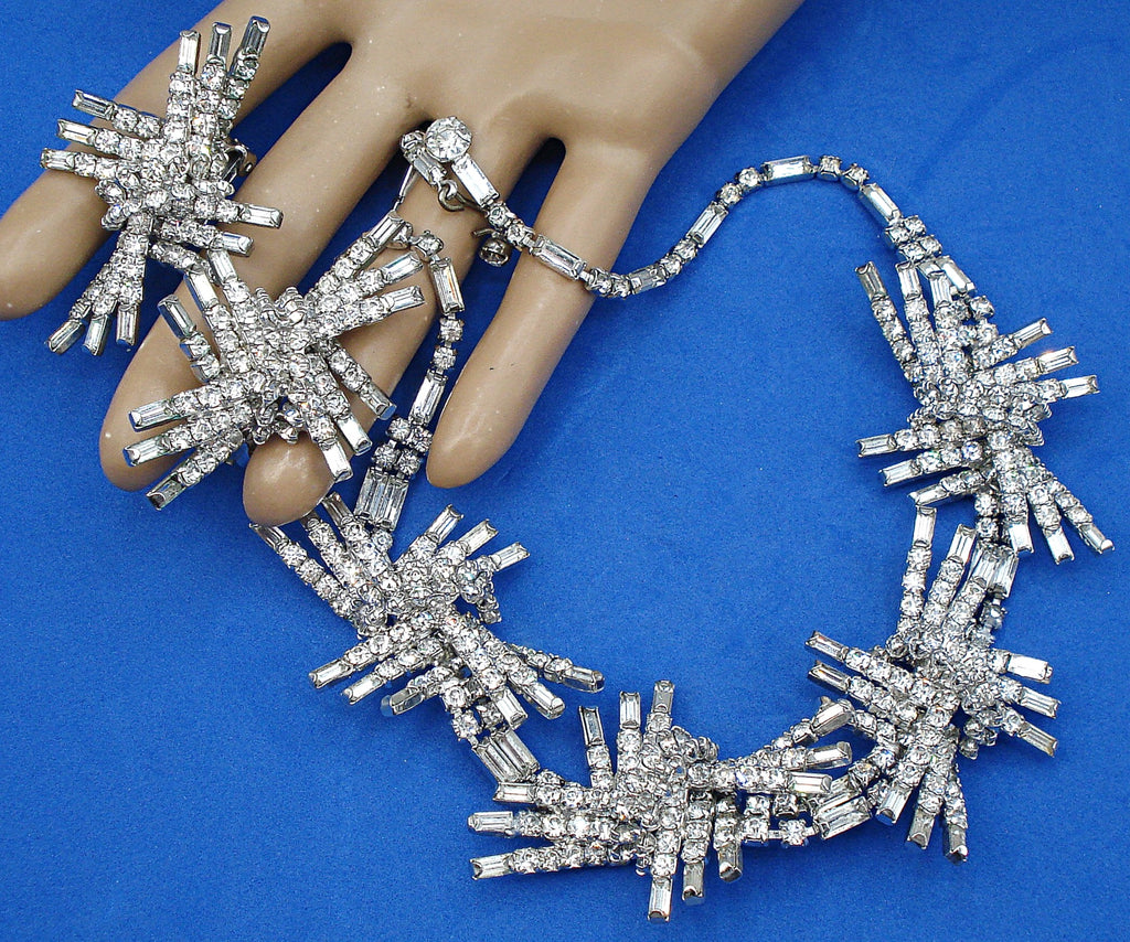 Unique Statement Set Silver Tone Firecracker Bows Prong Set Crystal Rhinestones