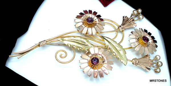 ~VINTAGE 5" VAN DELL 1/20 12KT OVER STERLING SILVER FLORAL FLOWER BOUQUET AMETHYST RHINESTONES FAUX PEARLS. Very Nice Condition.