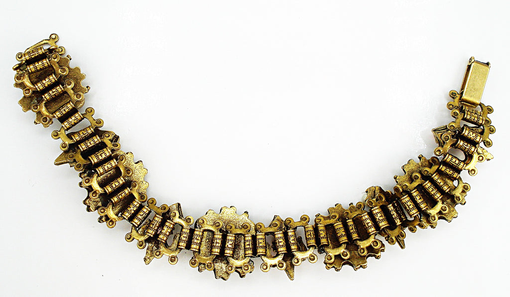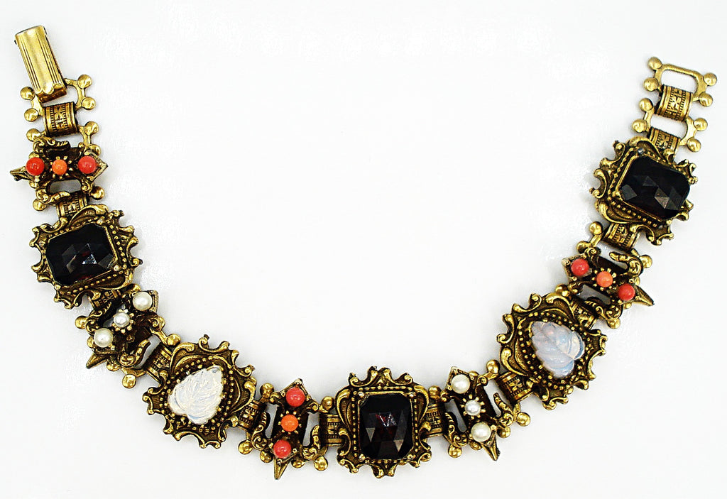 Victorian Revival Bracelet Moonstone Leaves Faux Garnet Pearls Corals Gold Tone