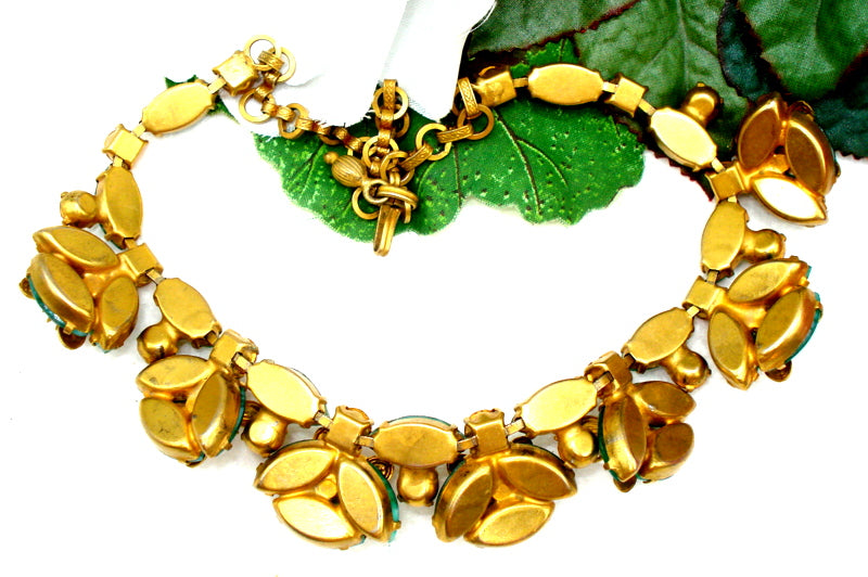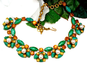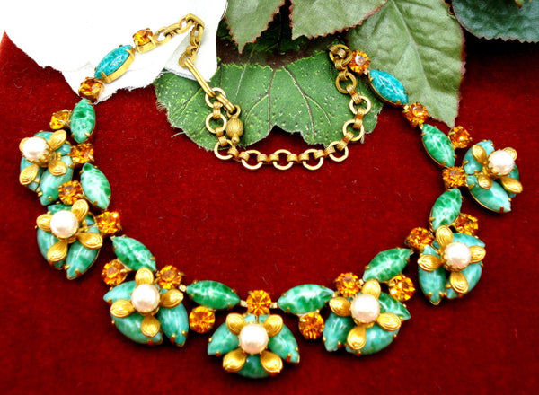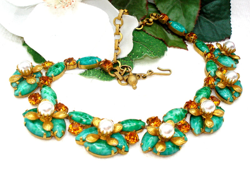 ~VINTAGE VICTORIAN REVIVAL CHOKER NECKLACE FAUX JADE PEARLS TOPAZ RHINESTONES GOLD TONE PRONG SET. 16" x 1" 7mm faux white pearls, glass chinese jade marquises, 6.2mm 29ss topaz rhinestones.
