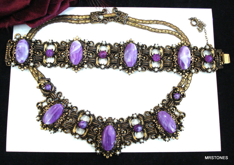 ~VINTAGE VICTORIAN REVIVAL SET NECKLACE BRACELET AMETHYST PURPLE MARBLE LUCITE STONE WITH FAUX PEARL ACCENTS. ANTIQUED GOLD TONE DETAILED. DOUBLE FLAT CHAIN FOR THE NECKLACE, SAFETY CHAIN FOR THE BRACELET. BRACELET IS 7.5" X 1 3/8", NECKLACE IS 15" X 1 3/8.