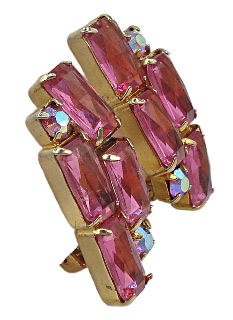 Vintage 1" Clip on Earrings Gold Tone Fancy Cut Rose Pink Rhinestones.  Prong Set AB Rhinestone Accents.