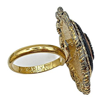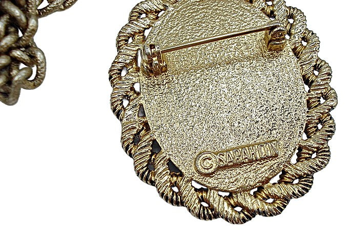 Vintage 1975 Old Vienna Mosaic Set 24" Necklack - Adjustable Ring 1 1/8" on Top. Brooch Dangle Sarah Coventry Gold Tone Glass Oval Cabochons Antiqued Braided Gold Tone Setting. Hook on Dangle Brooch 3 1/2". Nice Vintage Condition