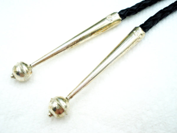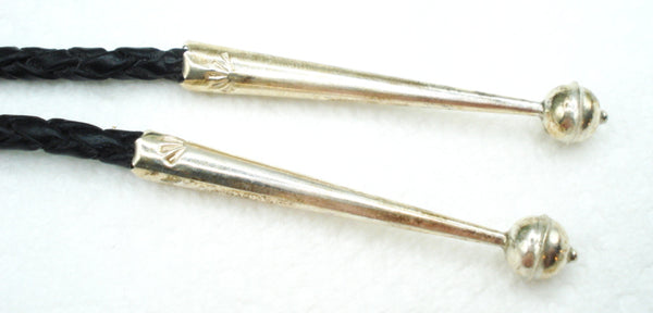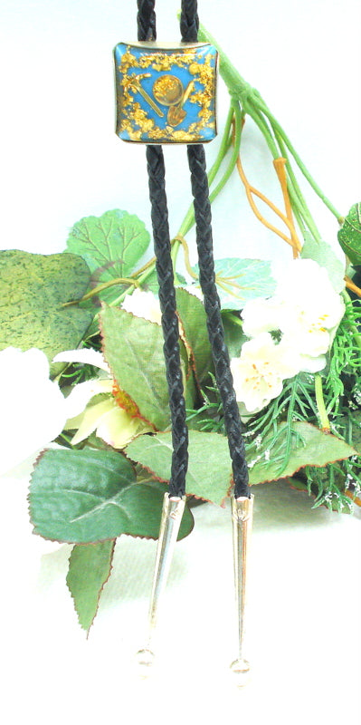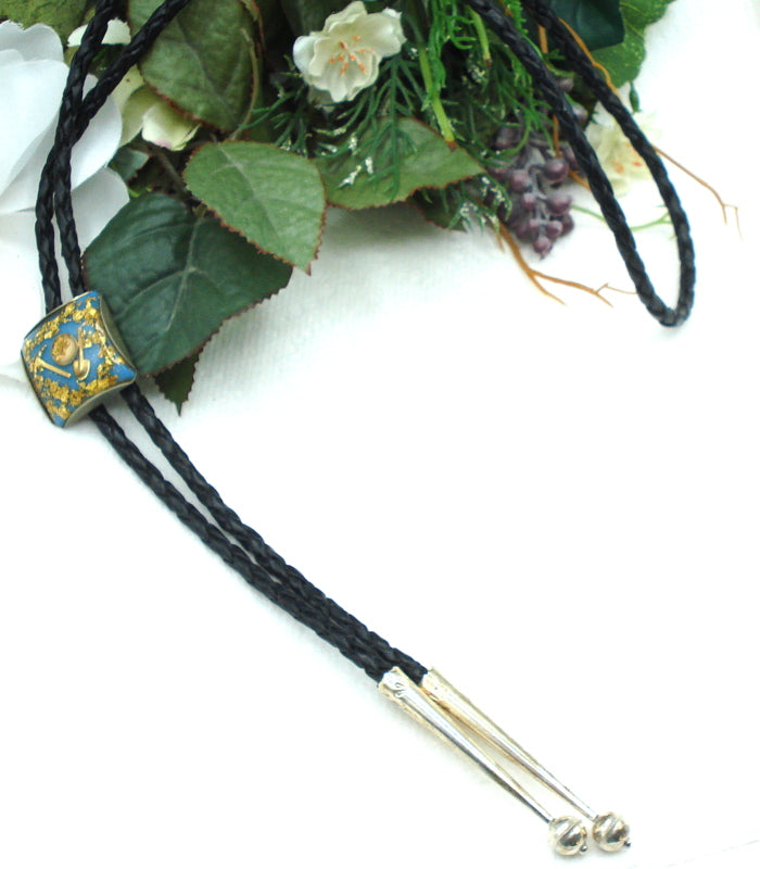 ~VINTAGE BOLO TIE SLIDE GOLD FLAKES MINERS TOOLS BLACK LEATHER CORD 925 STERLING SILVER ETCHED TIPS.  38" CORD AND 1" LUCITE BLUE WITH GOLD STONE SLIDE.