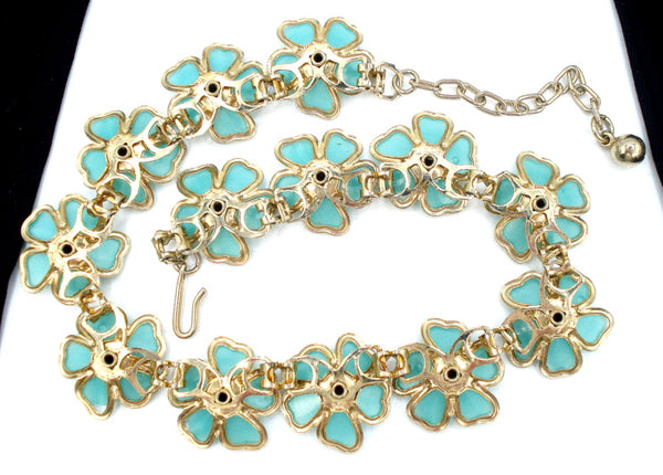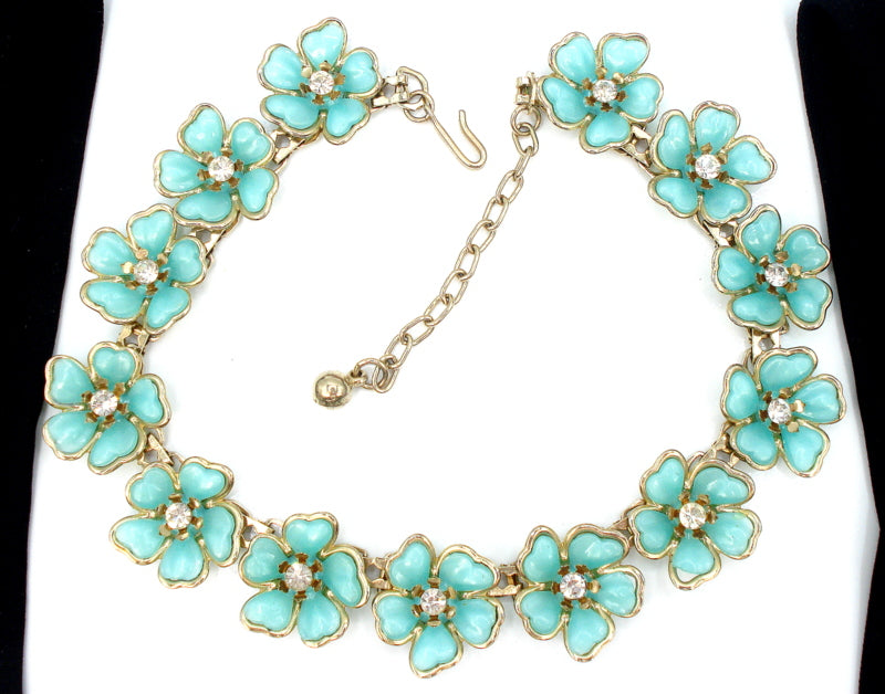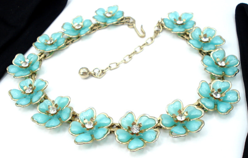 ~Vintage Choker Necklace Plastic Flowers Mint Turquoise Rhinestones Accents.  Gold Tone 16" x 7/8" Very Nice Condition.