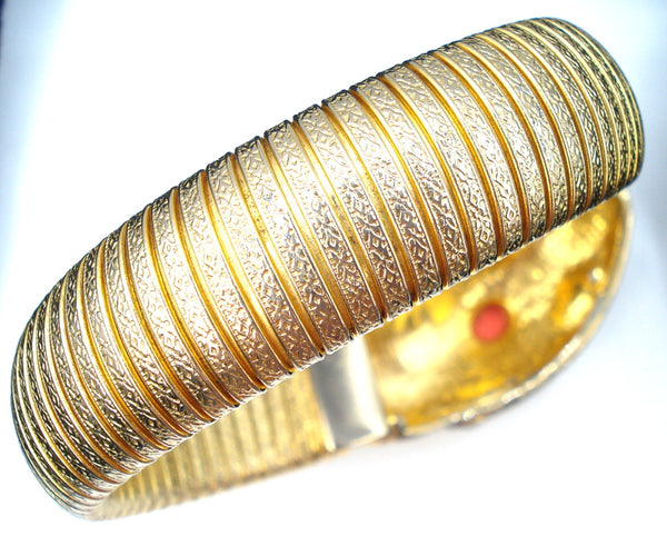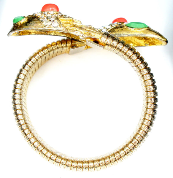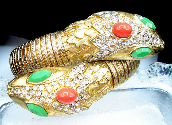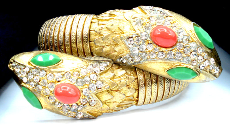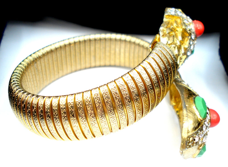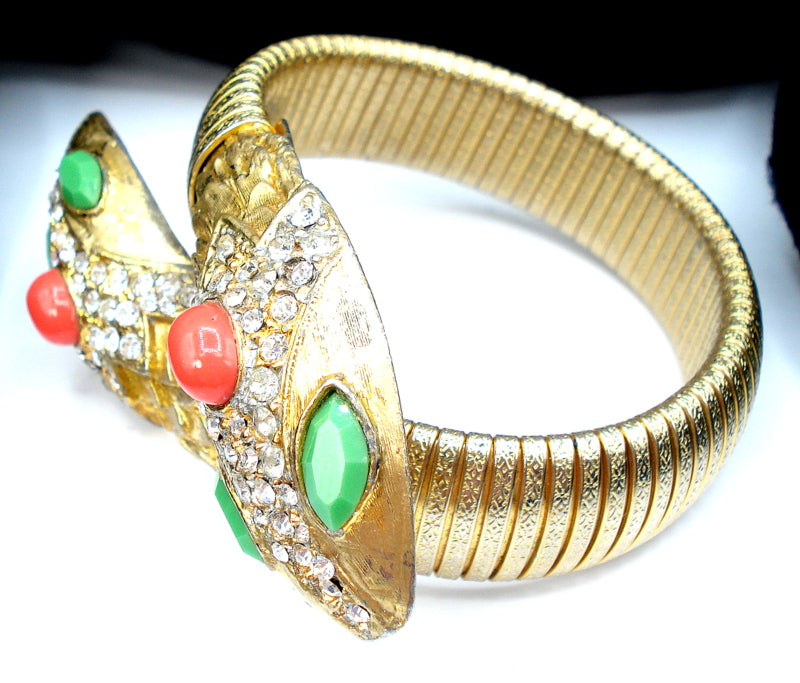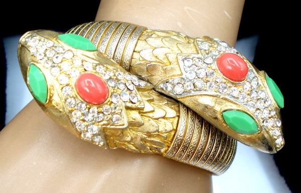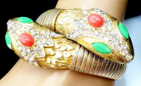 ~Vintage Double Snake Head Serpentine Rhinestone Bracelet. Gold Tone 6" Circumference. 5/8" wide with 1 1/5" Width for Snake Heads. Hooks on Scales. Crystal Rhinestones, Opaque Apple Green and Coral Glass Stones. Nice Condition.