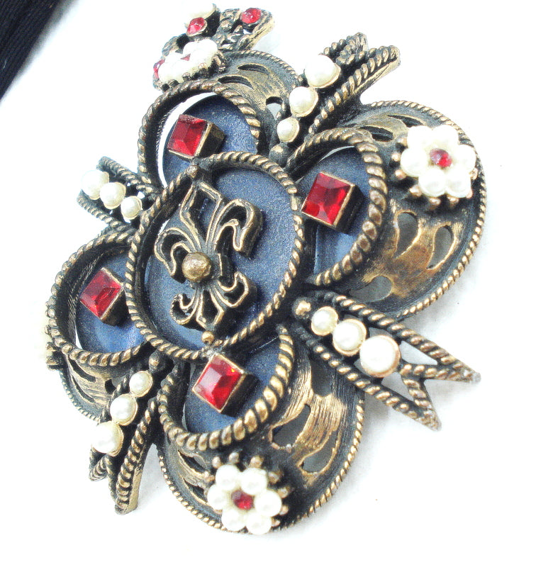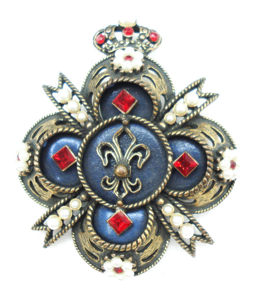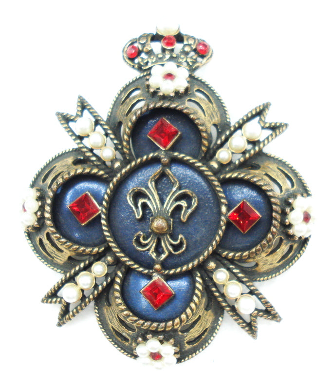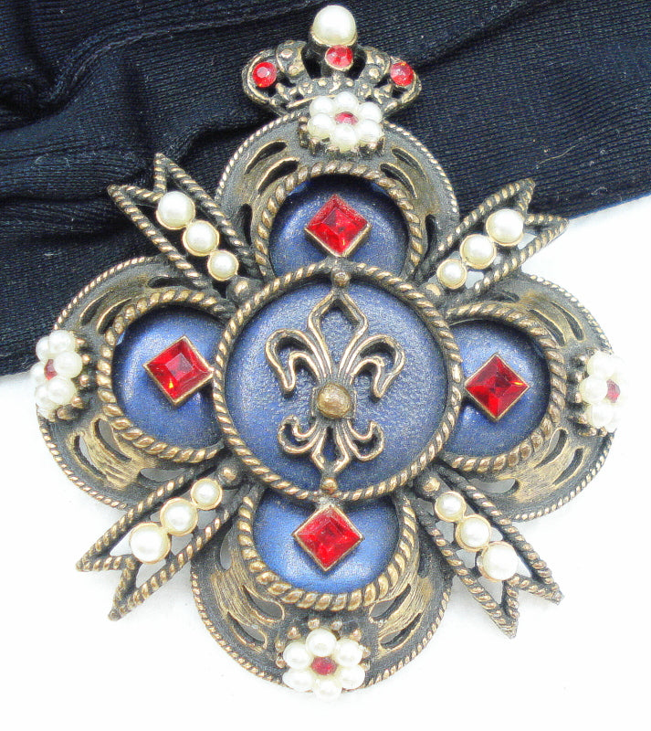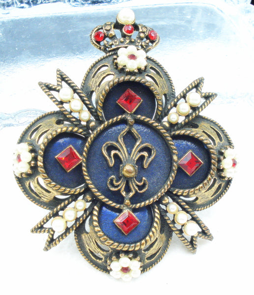 ~VINTAGE SIGNED WEISS UNIQUE CROSS SHIELD CROWN FLEUR DE LIS SIAM RED FAUX PEARS RHINESTONES.  NAVY BLUE BACKGROUND.  ANTIQUED GOLD TONE. 2.5".  Very nice Condtion.