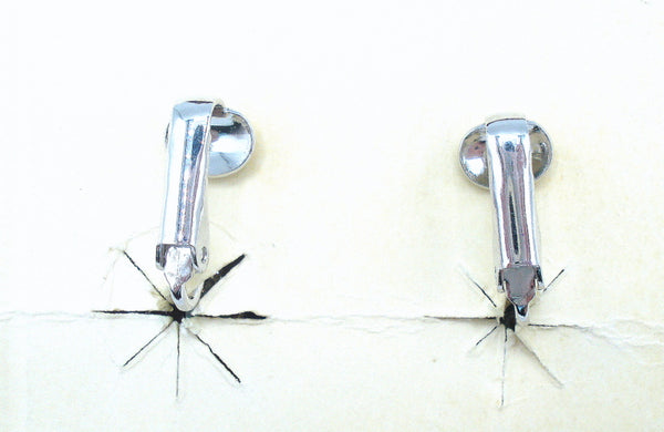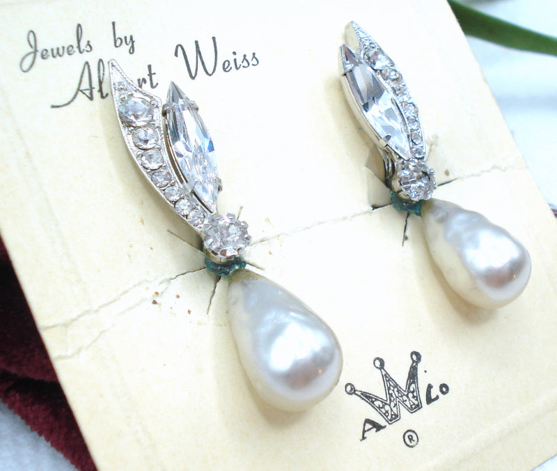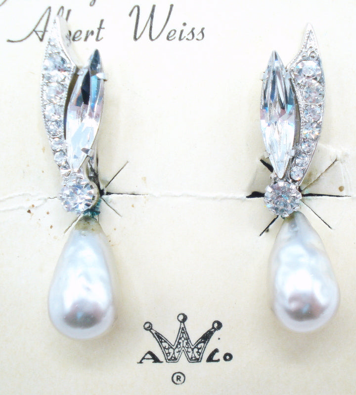 ~VINTAGE WEISS CLIP EARRINGS ON CARD GLAM CRYSTAL RHINESTONES FAUX PEARL DANGLES 1.5".  Very Nice Condition.