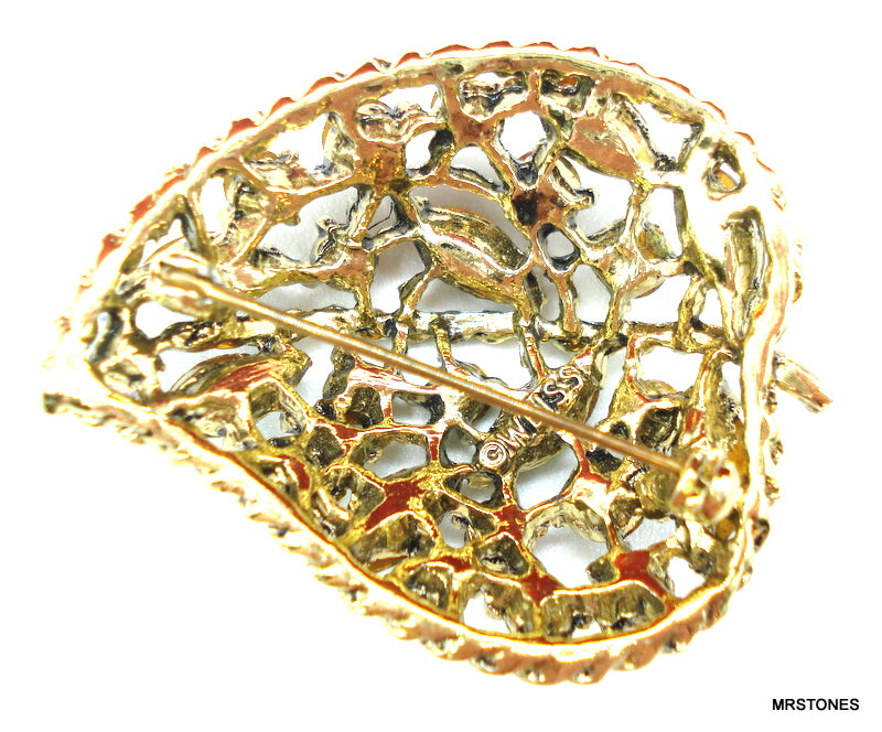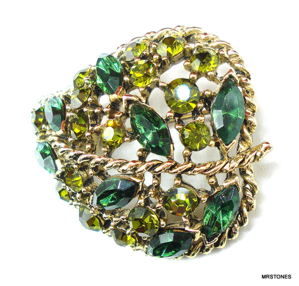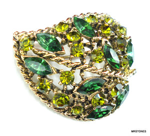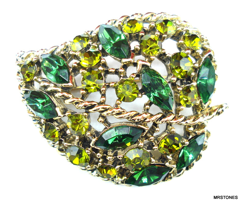 ~VINTAGE SIGNED WEISS LEAF 2" BROOCH GOLD TONE TWIST GREEN TOURMALINE MARQUISE OLIVINE ROUND RHINESTONES.  Very nice condition.