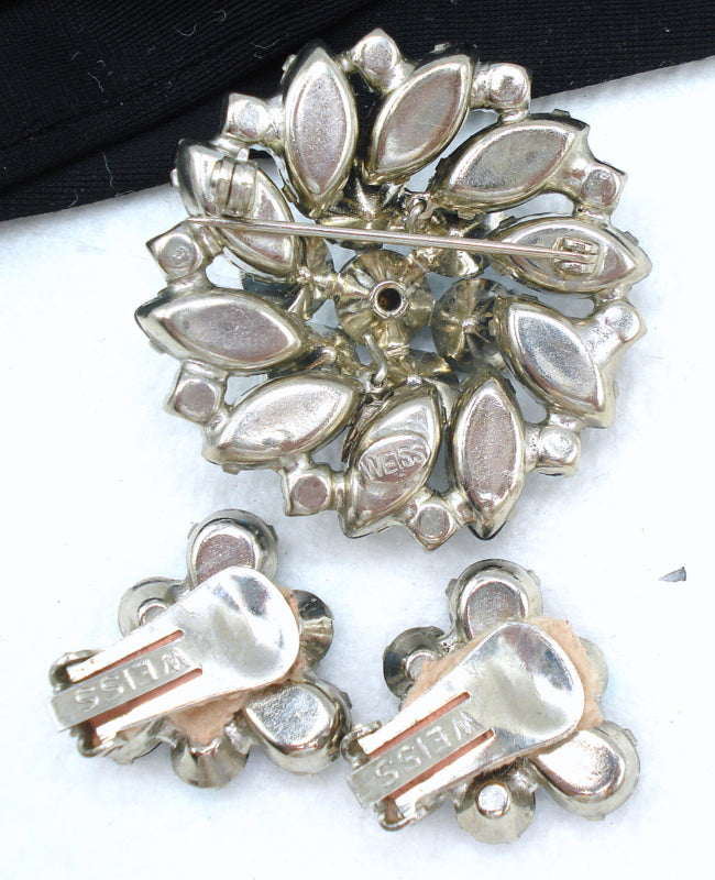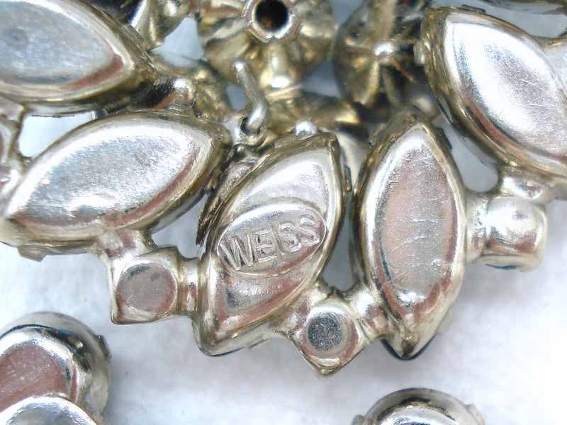 ~VINTAGE SIGNED WEISS SET 1 3/4" BROOCH/7/8" CLIP ON EARRINGS - SILVER TONE RHODIUM PLATED BLUE MONTANA SAPPHIRE PEAR, MARQUISE BUFF TOP DOUBLETS LIGHT SAPPHIRE AB PRONG SET ROUND RHINESTONES.  Very Nice Condition.